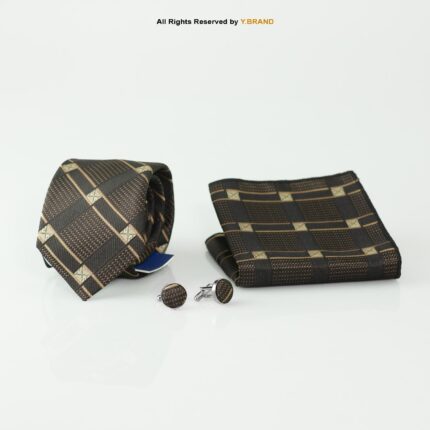 Chocolate Brown Plaid Tie Gift Set: Necktie, Pocket Square & Cufflinks TS-1074