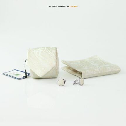 Cream Paisley Tie Gift Set – 3pc Wedding Necktie, Pocket Square & Cufflinks TS-1076