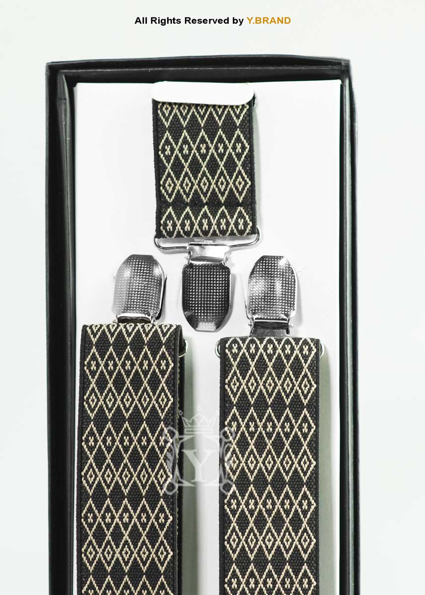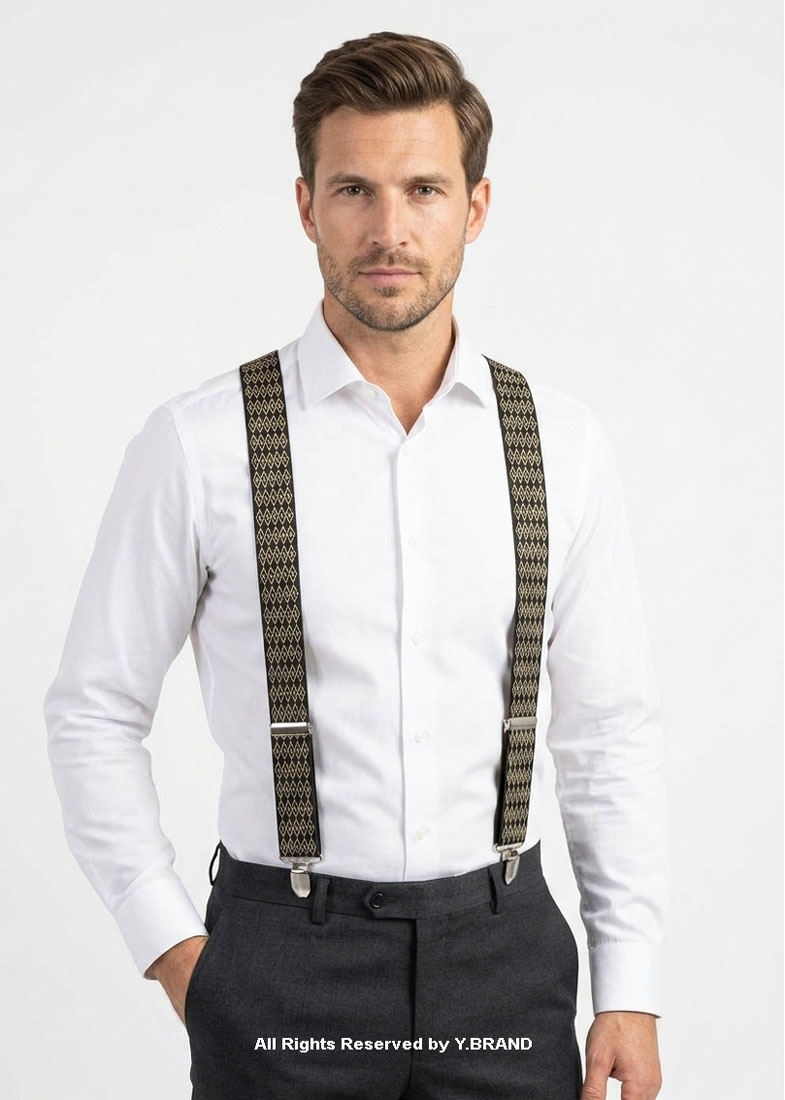 Enhance your formal ensemble with the SB-1073a Argyle Jacquard Suspenders by Y.BRAND. Featuring a sophisticated interlocking diamond motif in antique gold on a premium black woven base, these suspenders offer a refined vintage aesthetic for the modern gentleman.