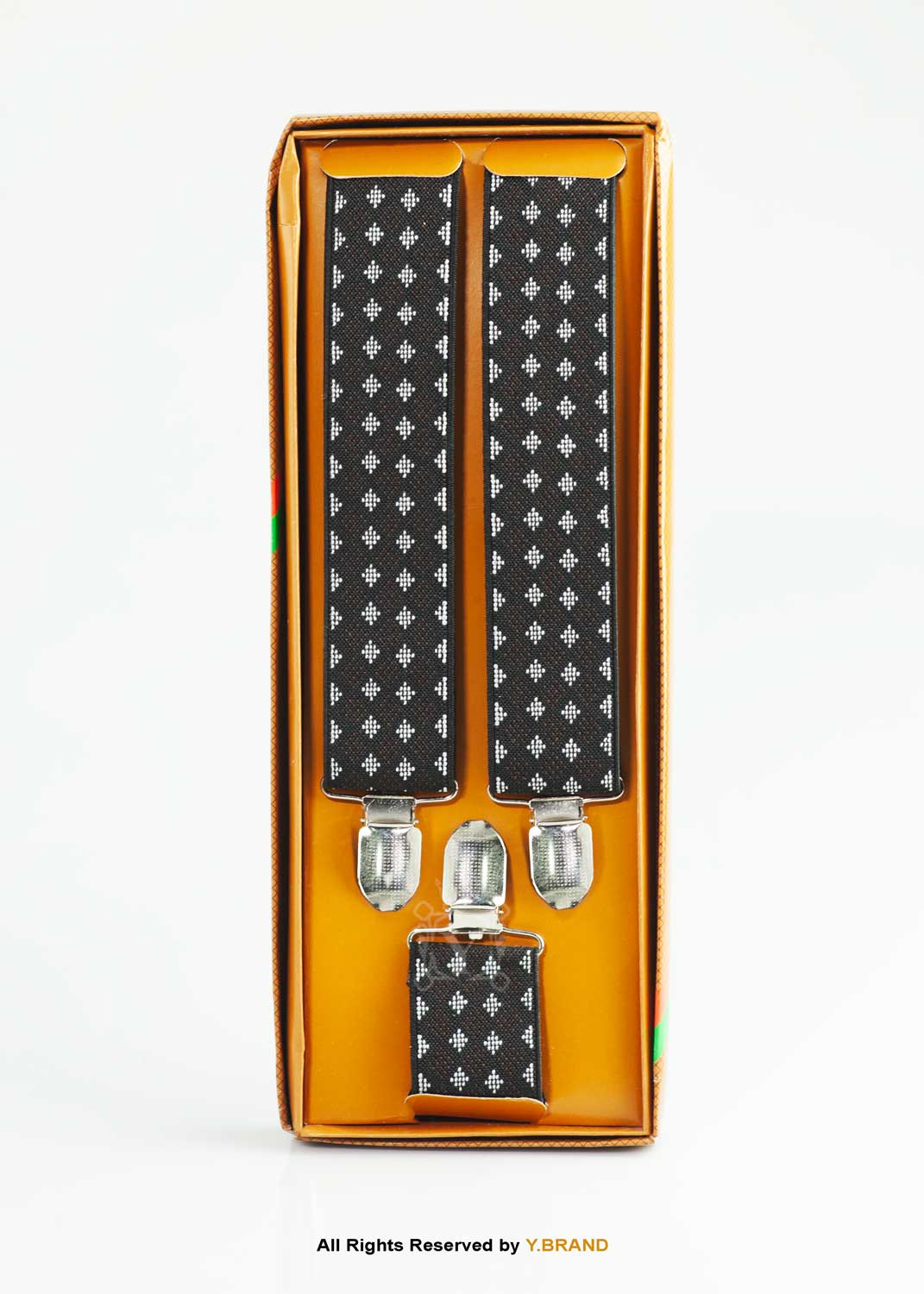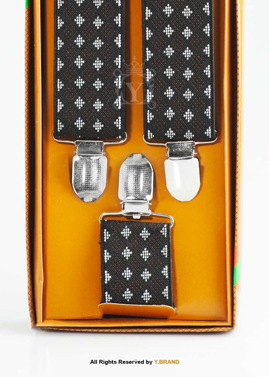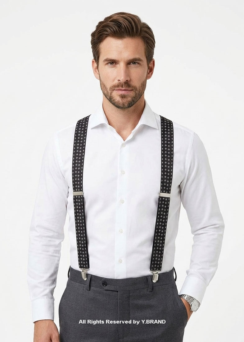 Refine your formal ensemble with these premium Y-Back Suspenders by Y.BRAND. This design features a striking star-like geometric pattern in silver-white, woven into a deep black jacquard base. It’s an ideal choice for the gentleman looking to add a touch of personality to a classic suit without compromising on elegance.