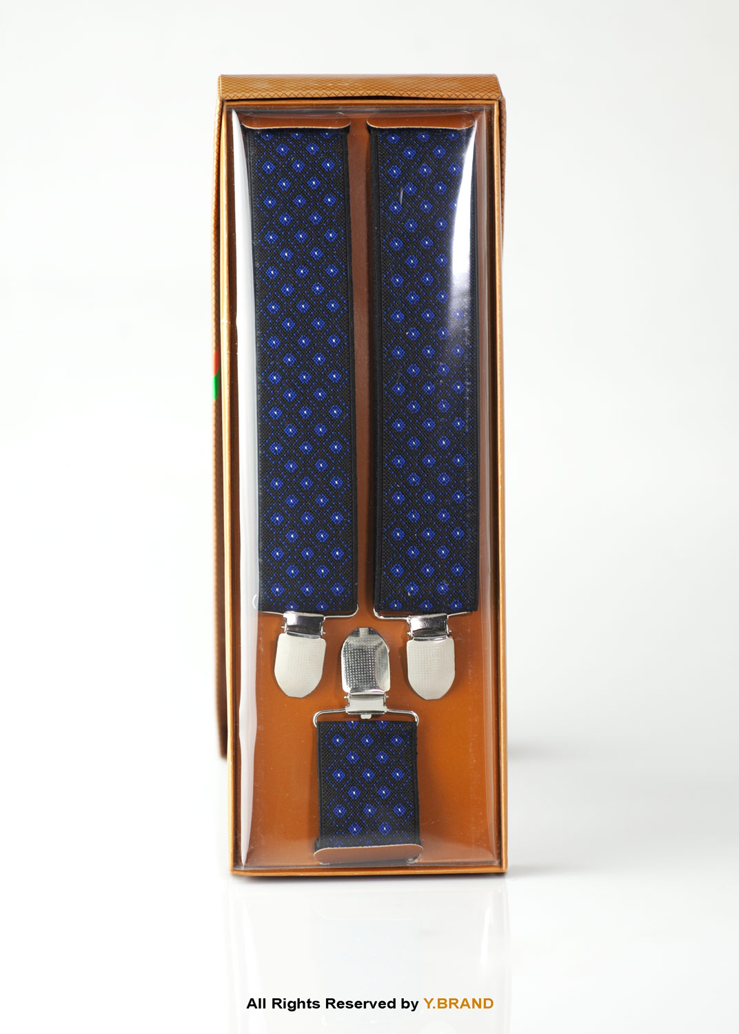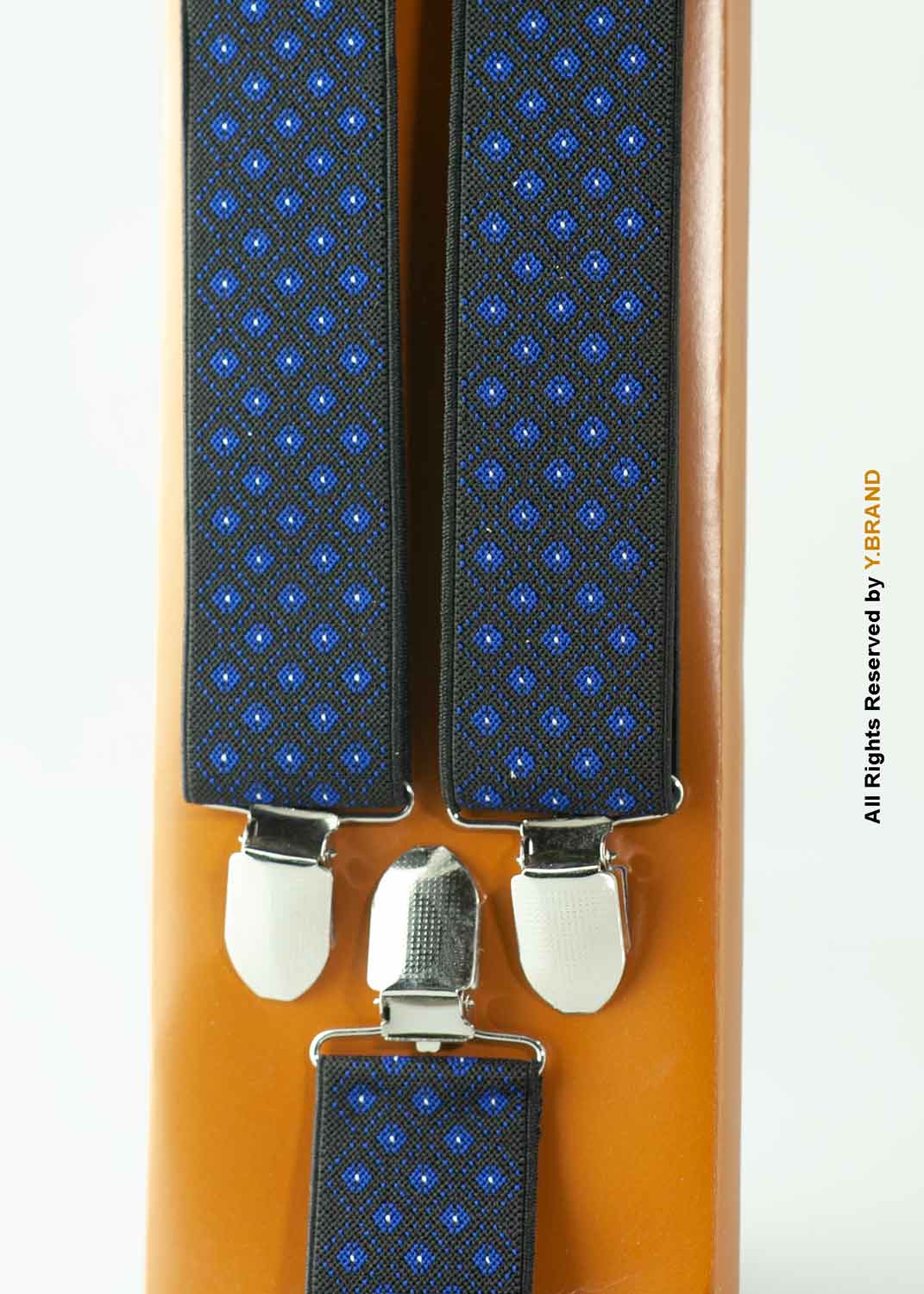 The blue-based textured three-clip elastic suspenders are very stylish for the office or a night out. These classic Y-back suspenders make for a wonderfully versatile addition to any wardrobe. They are elegant and refined and work especially well with a blazer and bowtie for a put-together, preppy look.