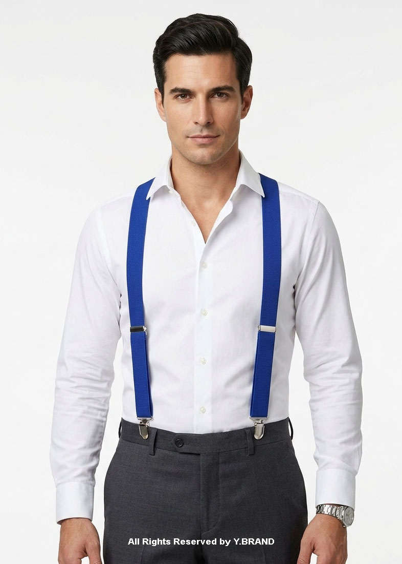 The classic blue three-clip elastic suspenders are very stylish for the office or a night out. These classic Y-back suspenders make for a wonderfully versatile addition to any wardrobe. They are elegant and refined and work especially well with a blazer and bowtie for a put-together, preppy look.