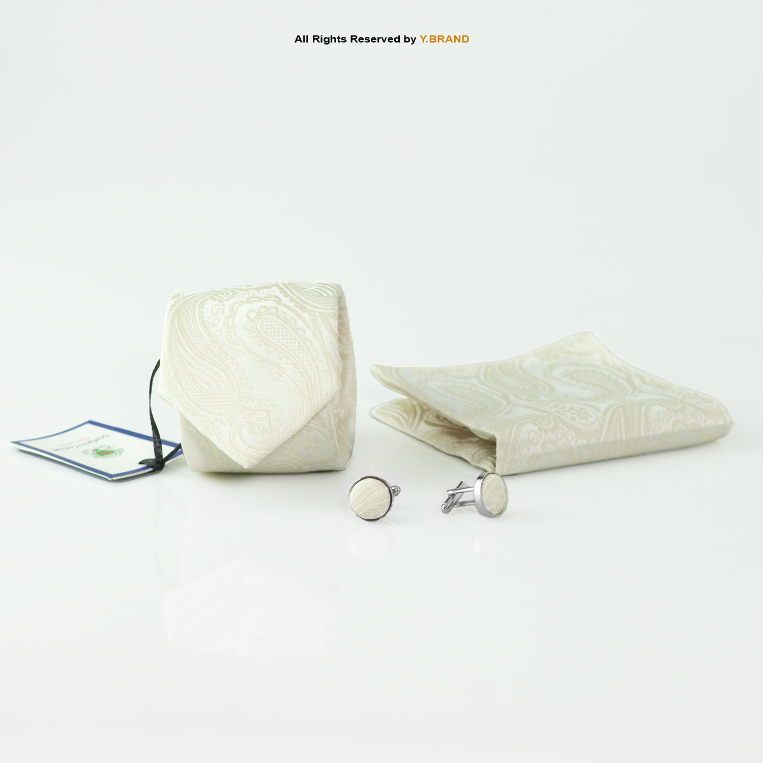 Cream Paisley Tie Gift Set – 3pc Wedding Necktie, Pocket Square & Cufflinks TS-1076