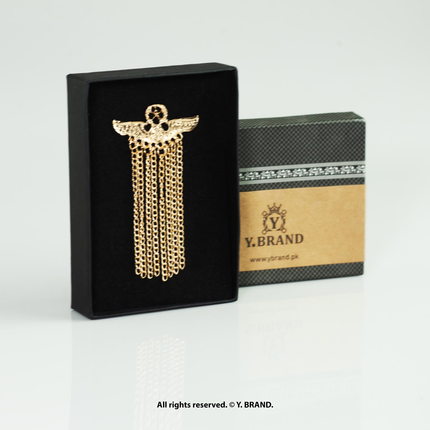 Delicate design. Statement presence. Wearable art for every occasion. A beautifully crafted brooch that adds character to blazers, sherwani, scarves, and formal wear—finished in gold tone with chain tassel detailing and a secure pin-back clasp.