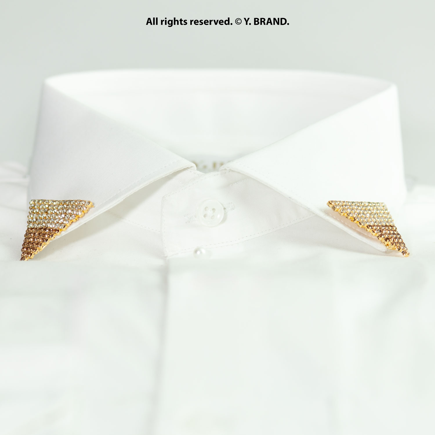 Sharp detail. Subtle power. The finishing touch that elevates every look. A finely crafted collar pin that brings structure and sophistication to dress shirts, kurtas, and formal wear—finished in gold tone with a gradient crystal triangle design and a secure slide-through clasp.