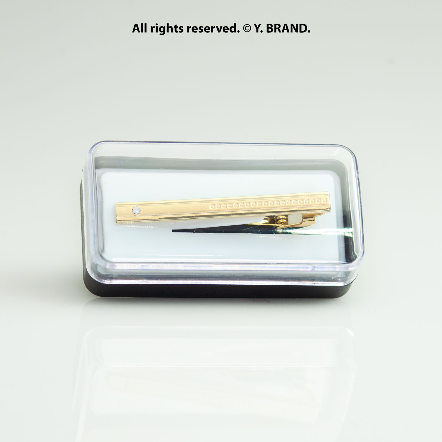 Sharp lines. Iconic detail. Keeps your tie in place all day. A precision-crafted tie clip built for the modern gentleman finished with a gold tone, secure slide-lock mechanism, and studded line detailing. Perfect for formal events, office wear, and gifting.