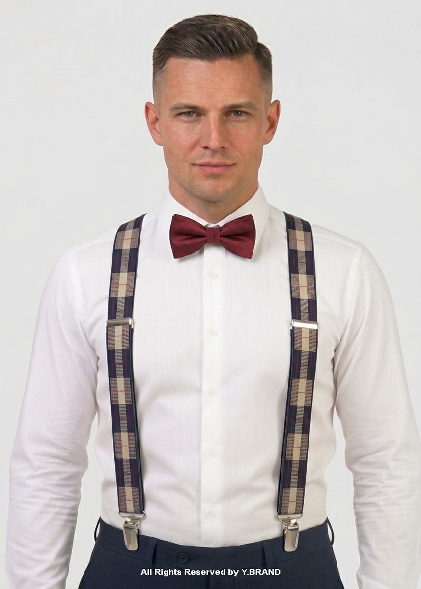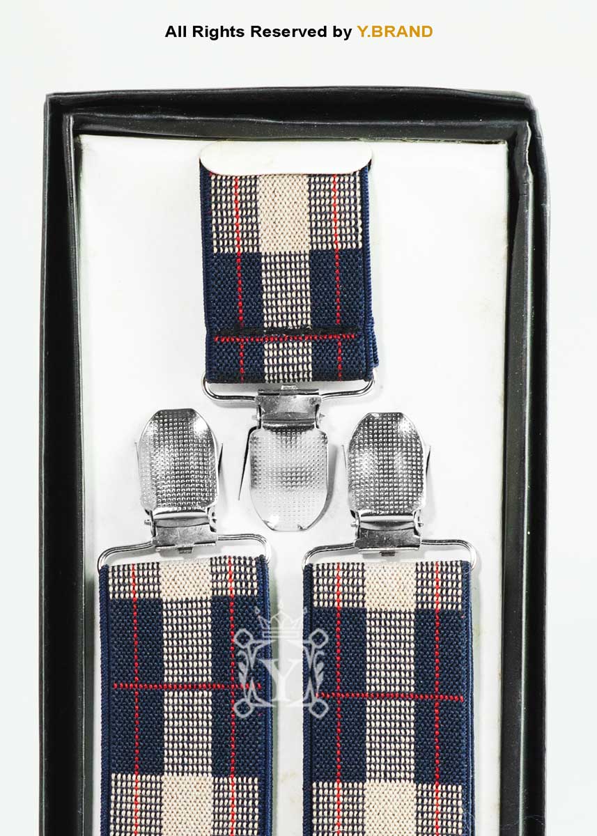 Infuse your formal wardrobe with classic British-inspired style with the SB-1077 Windowpane Tartan Suspenders by Y.BRAND. This design features a bold, large-scale check pattern in deep navy blue and cream, accented by a subtle red pinstripe. It is the ideal accessory for the gentleman looking to add a touch of heritage charm to a tweed blazer, navy suit, or a simple white button-down.