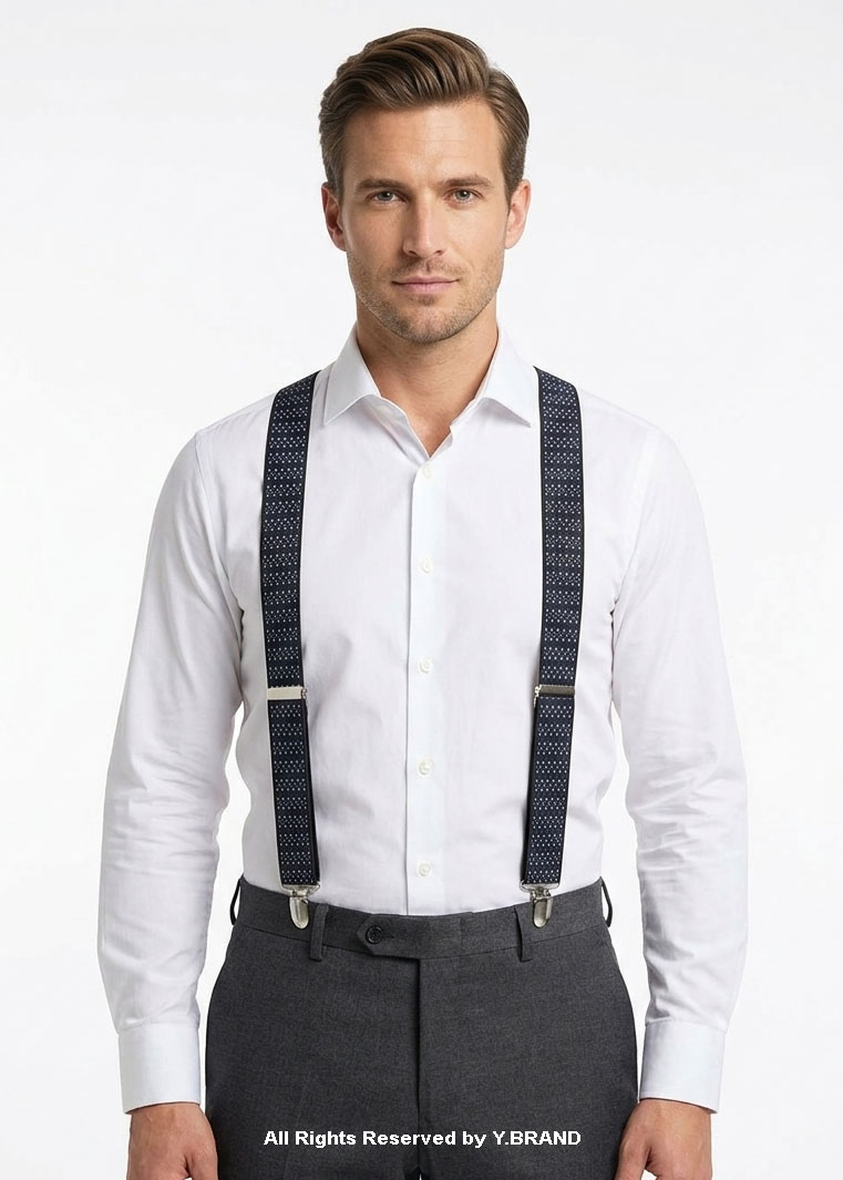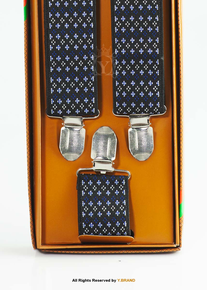 Elevate your formal attire with these premium Y-Back Suspenders by Y.BRAND. Featuring a sophisticated navy blue and silver diamond jacquard motif on a deep black base, these suspenders are the perfect accessory for the modern gentleman who values both refined style and functional stability.