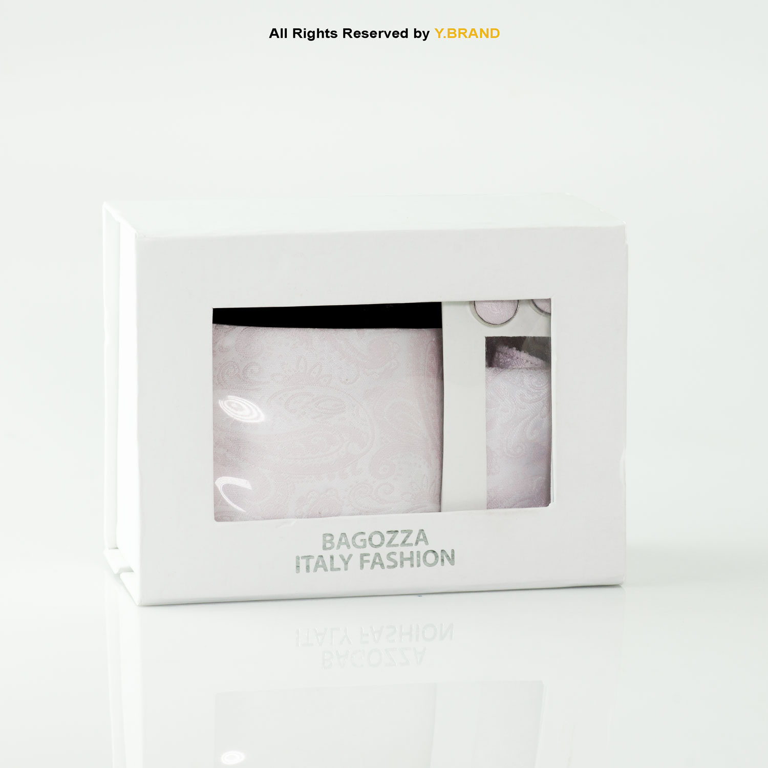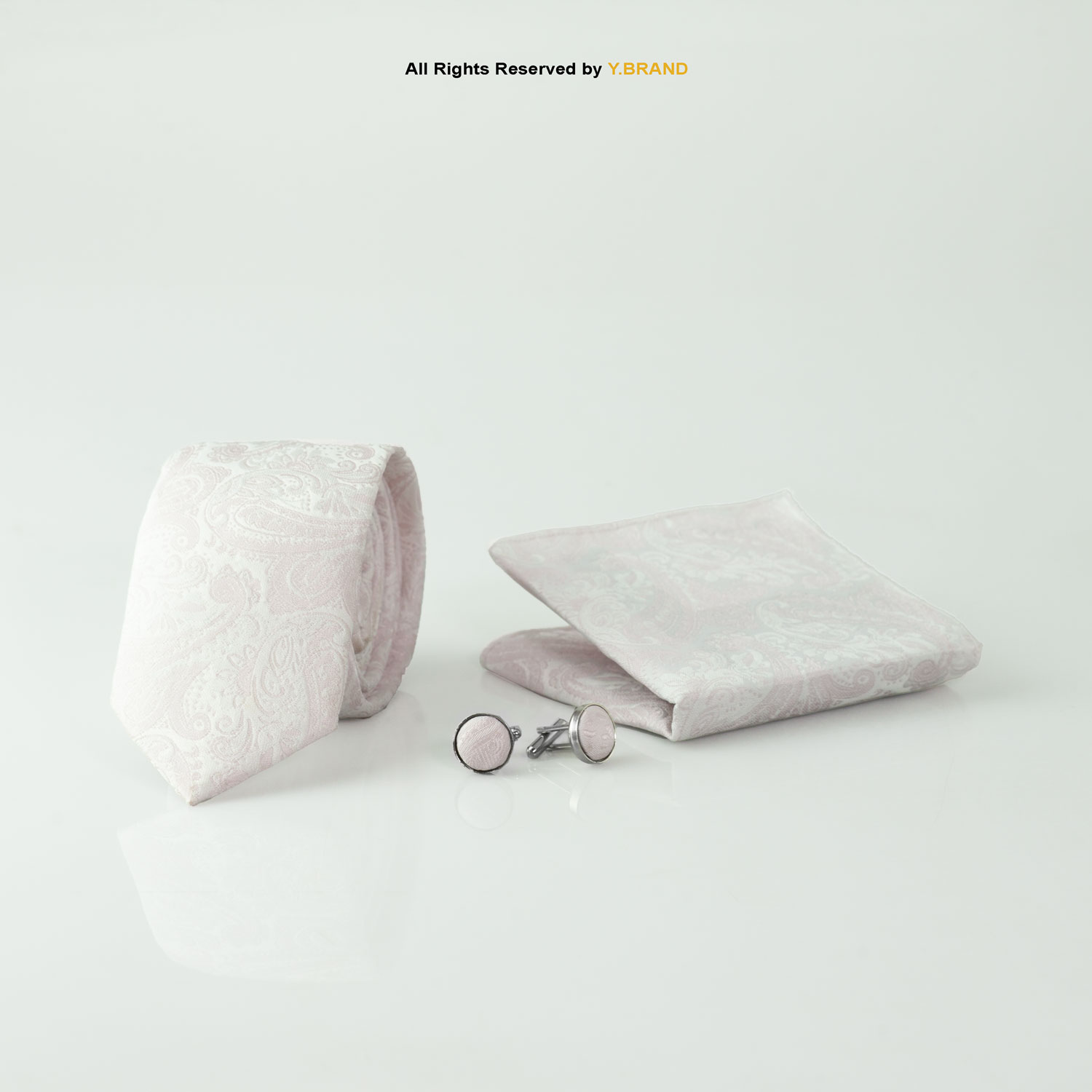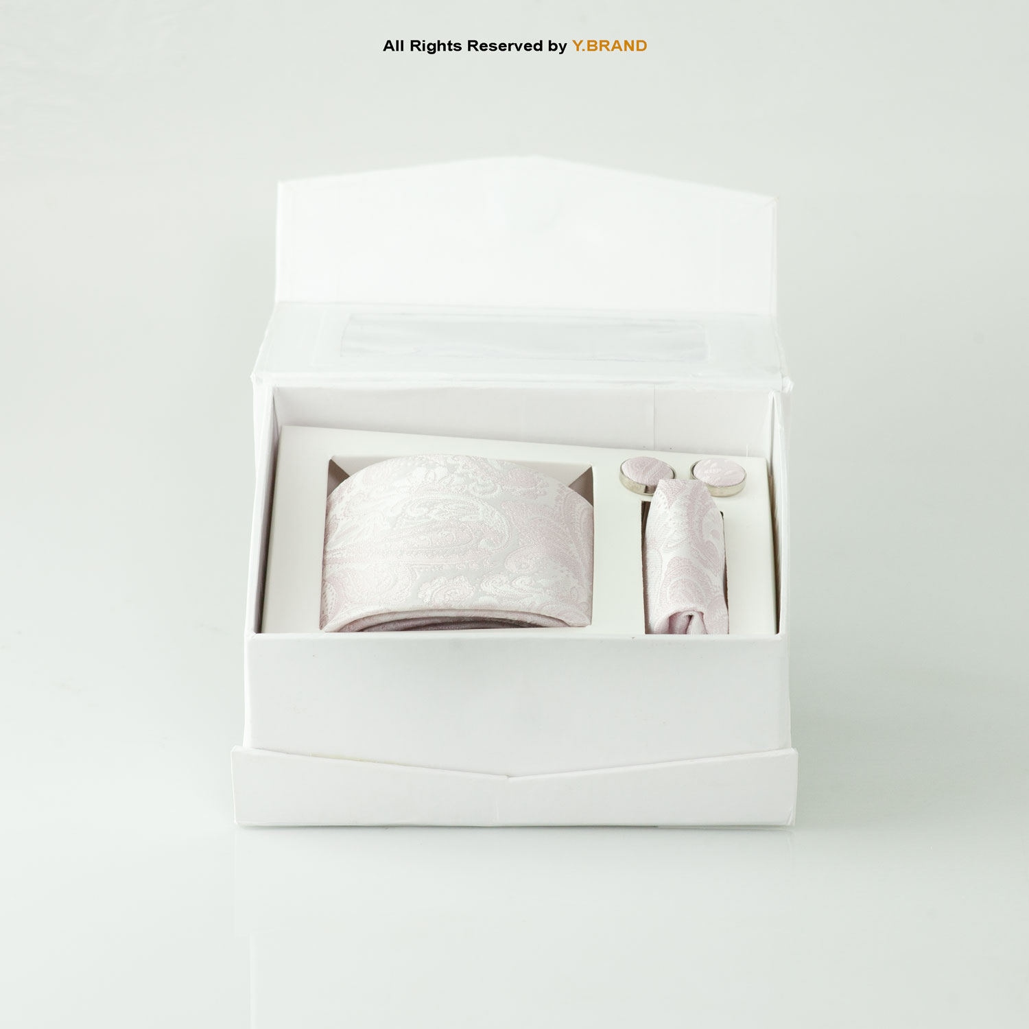 Elevate your formal wardrobe with the Y.BRAND Blush Pink Paisley Tie Gift Set. This expertly curated 3-piece collection features a high-quality silk necktie with an intricate silver-pink paisley pattern, perfectly complemented by a matching pocket square and coordinating round cufflinks.