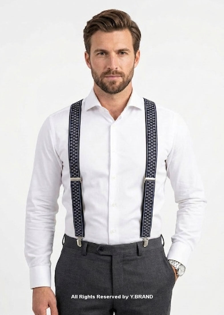 Command attention with the Royal Blue Cross-Stitch Suspenders from Y.BRAND. This design utilizes a distinctive cross-hatch geometric pattern in silver-white, bordered by bold royal blue stripes. It’s a versatile accessory that pairs exceptionally well with navy, grey, or black trousers for a high-contrast, polished look.