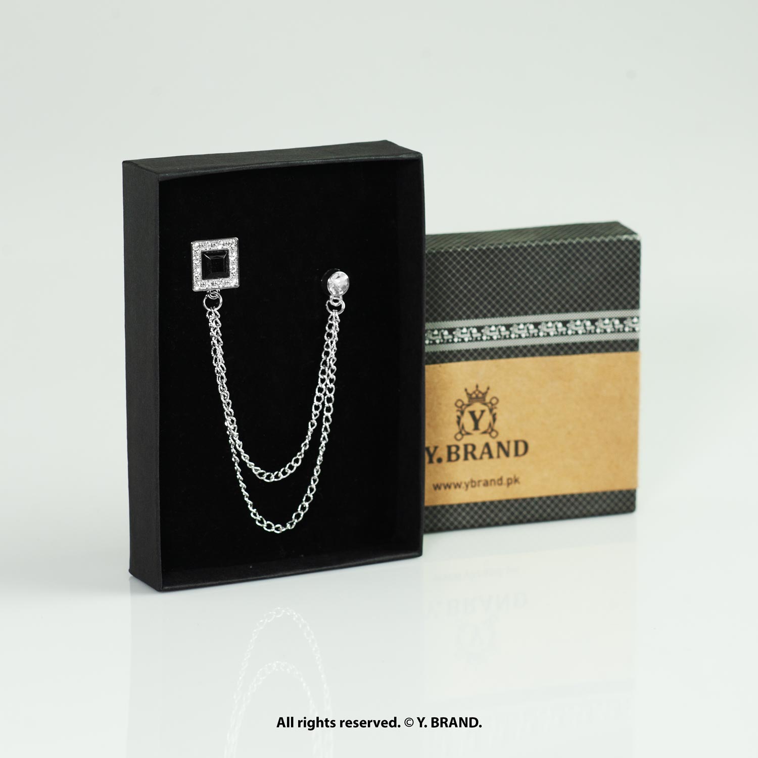 Delicate design. Statement presence. Wearable art for every occasion. A beautifully crafted brooch that adds character to blazers, sherwani, scarves, and formal wear—finished in silver tone with black square crystal double chain detailing and a secure pin-back clasp.