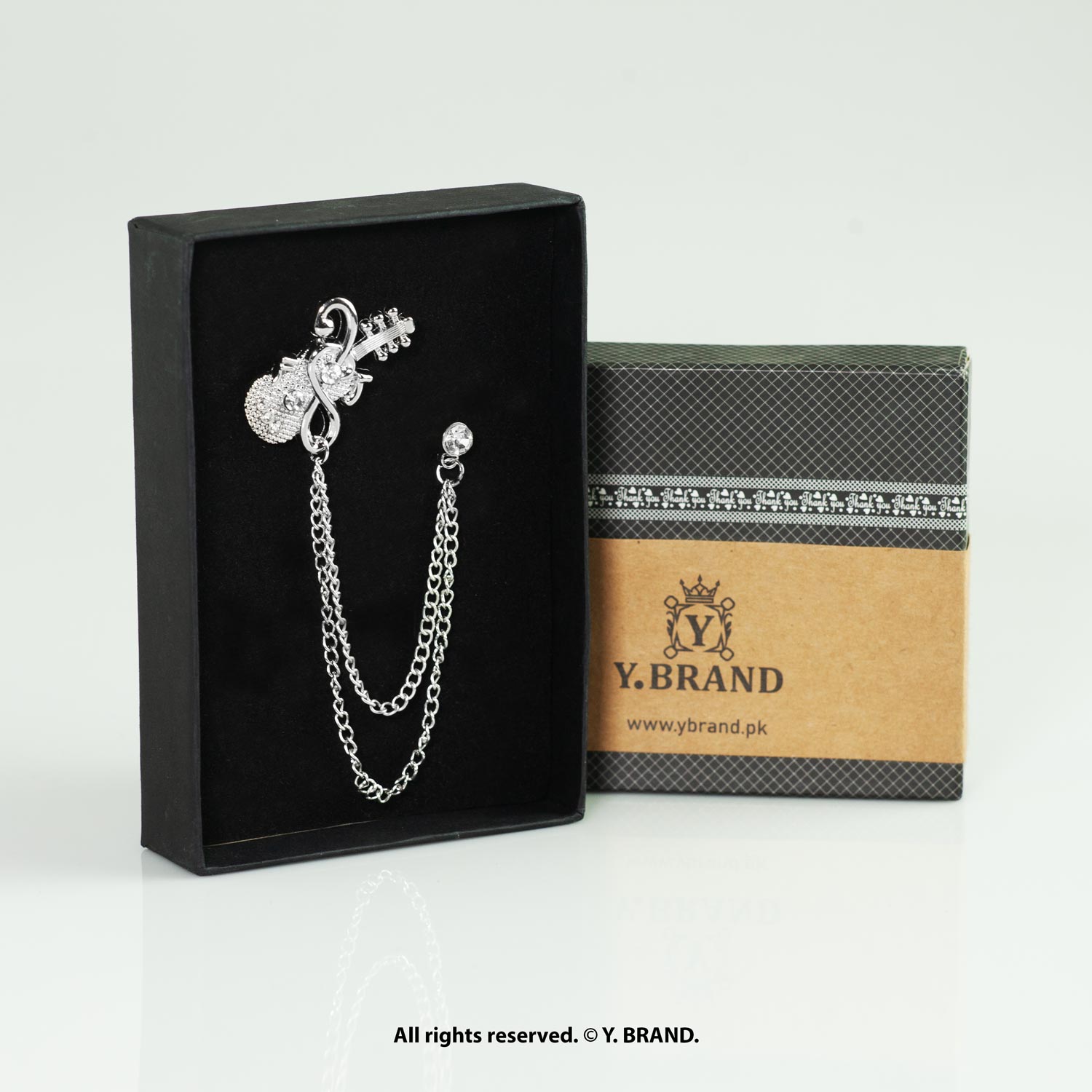 Silver Brooch Crystal Guitar Treble Clef Double Chain – B-1142